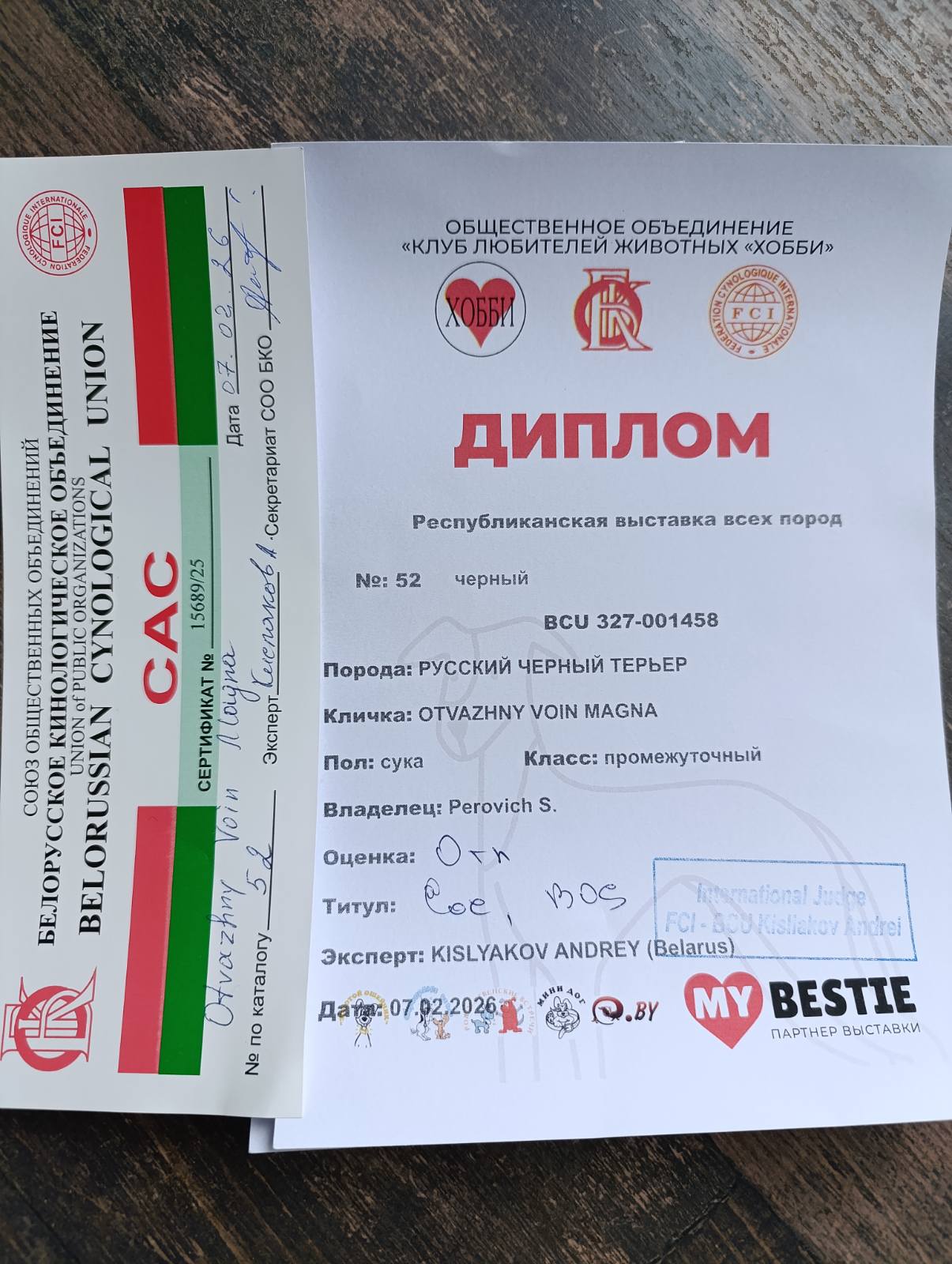 Минск (РБ)07.02.2026 Республиканская выставка собак всех пород г. Минск (РБ), эксперт Андрей Кисляков (РБ). Otvazhny Voin MAGNA (FN Ombudsman x OV Iliana) класс промежуточный - отл., САС, BOS! Грумер/ хендлер Светлана Перович.