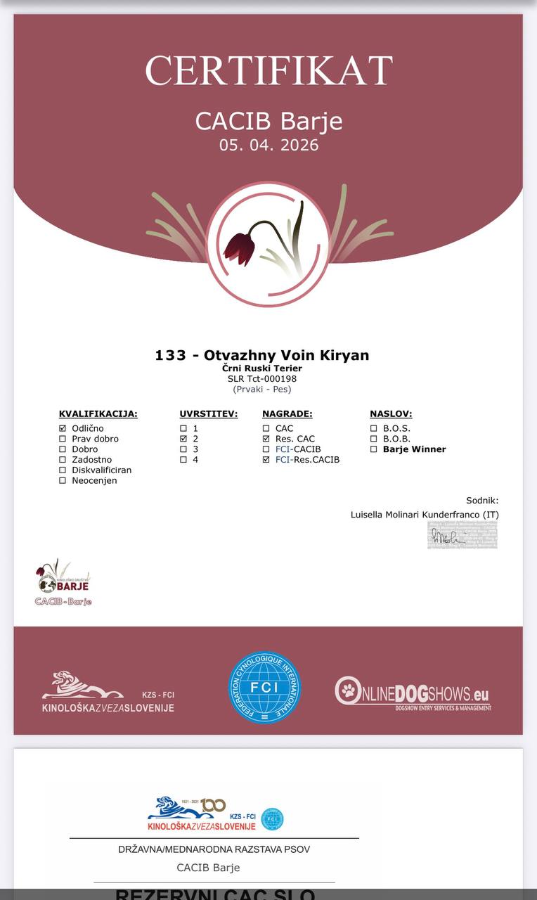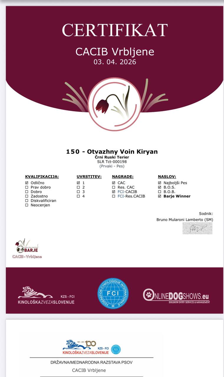03.04.2026 - 05.04.2026 Barje (Словения) 2хIDS. Pксперты -Bruno Mularoni Lamberto (SM), Luisells Molenari Kunderfranco ( IT).Otvazhny Voin KIRYAN (OV Dragon Udachi x OV Epifanya) - exl -1, CAC, CACIB, BOS. "BARJE WINNER"!exl -2, rCAC, rCACIB!Поздравления владелице/ грумеру/ хендлеру Podlisetskaja Elvira. https://www.onlinedogshows.eu