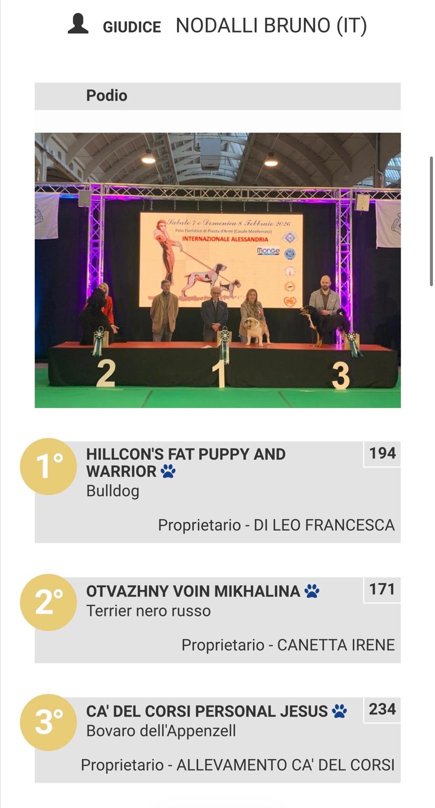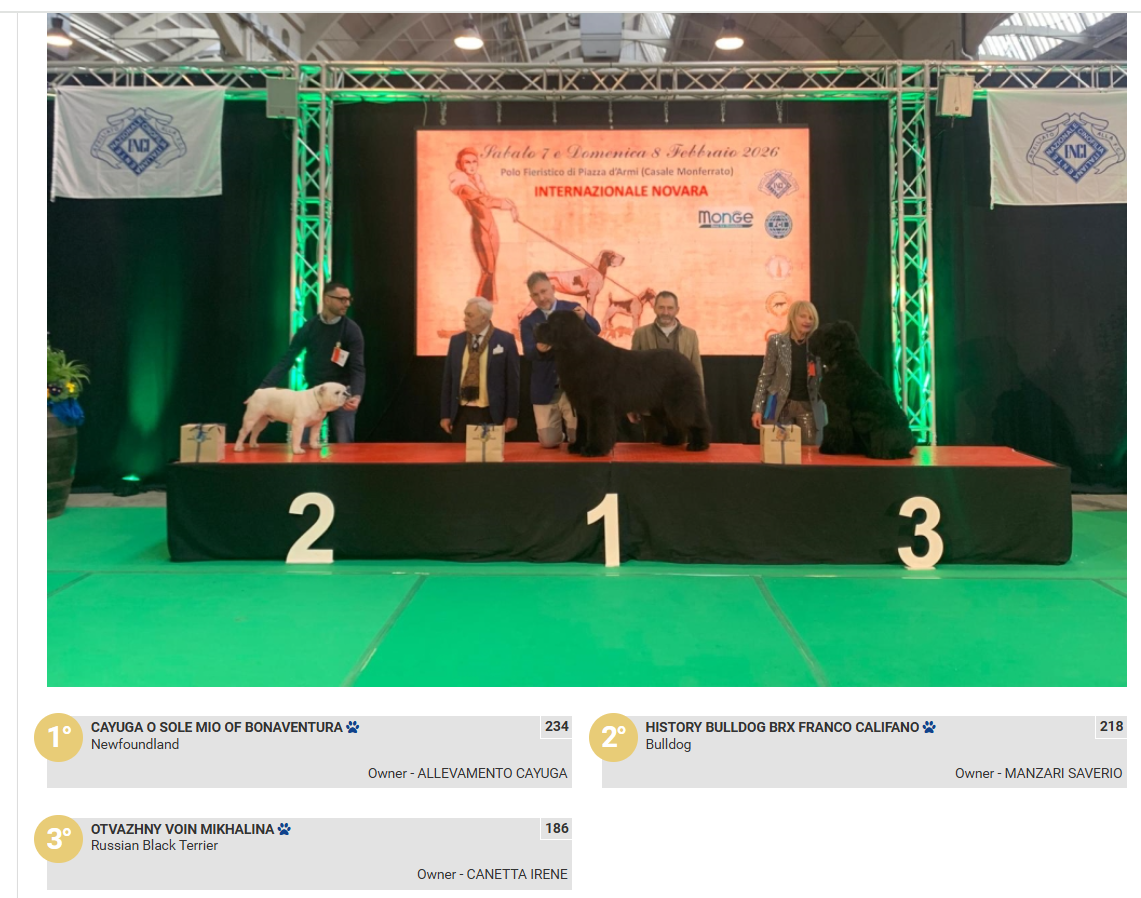 07.02.2026. Casale Monferrato AL, (Italia) ESPOSIZIONE INTERNAZIONALE ALESSANDRIA (International Dog Show). Judge Poggesi Manola (IT). Otvazhny Voin Mikhalina (FN Ombudsman x OV Iliana) - CAC, BOB, CACIB, BOG-2!08.02.2026. Casale Monferrato AL, (Italia) ESPOSIZIONE INTERNAZIONALE NOVARA (International Dog Show). Judge Molinari Luisa (IT). Otvazhny Voin Mikhalina (FN Ombudsman x OV Iliana) - CAC, BOB, CACIB, BOG-3! Поздравления владелице/ грумеру/ хендлеру Irene Canetta! Все результаты выставки на www.show.enci.it